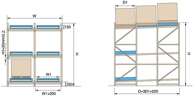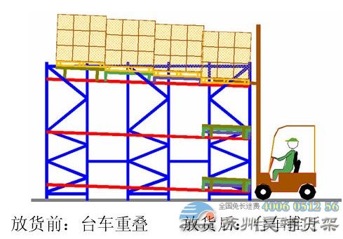 后推式貨架也由托盤式貨架演變而成,也叫壓入式貨架或推入式貨架。采用軌道和托盤小車相結(jié)合的原理,軌道呈一定的坡度(3°左右),利用貨物的自重,托盤貨物被規(guī)定于單端存儲(chǔ),貨物先進(jìn)后出,適用于大批量少品種的貨物存儲(chǔ),空間利用率很高,存取也較靈活方便。貨架總深度不宜過(guò)深,一般在6個(gè)托盤深度以內(nèi),否則由于托盤小車相互嵌入的緣故而會(huì)使空間犧牲較大。單托貨物重量一般在1500kg以內(nèi),貨架高度一般在6m以下。