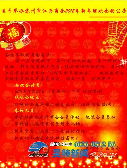 本公司消息:2011年12月30號(hào),昨天公司黃總應(yīng)邀參加蘇州江西商會(huì)2012年新年聯(lián)歡會(huì)。作為蘇州江西商會(huì)的一員,也是蘇州市蘇州江西商會(huì)誠信會(huì)員。
