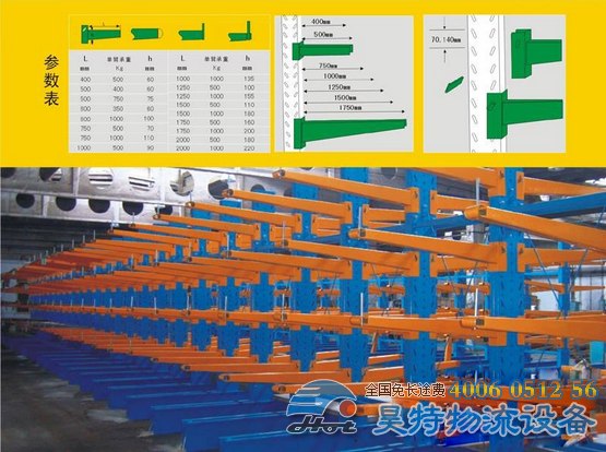 懸臂式貨架的高度通常在2.0米以內(nèi)(如由叉車存取貨則可高達5米),懸臂長度在2.0米以內(nèi),每臂載重通常在800KG以內(nèi)。
