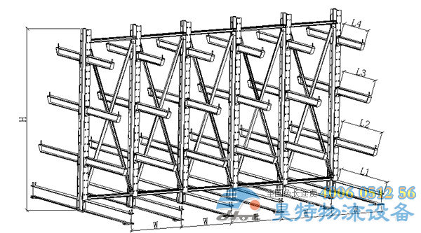懸臂式貨架的高度通常在2.0米以內(nèi)(如由叉車存取貨則可高達(dá)5米),懸臂長度在2.0米以內(nèi),每臂載重通常在800KG以內(nèi)。
