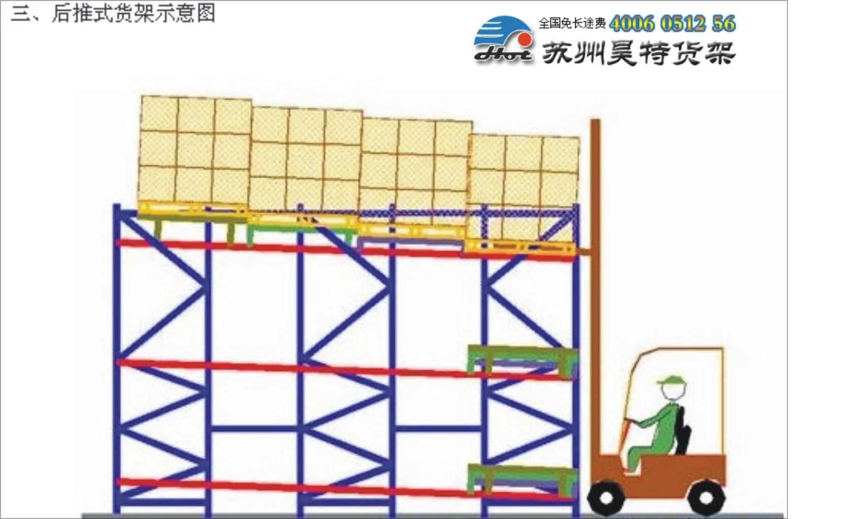 2.后推式貨架特點(diǎn):存儲(chǔ)空間利用高,結(jié)構(gòu)安全,作業(yè)效率高。