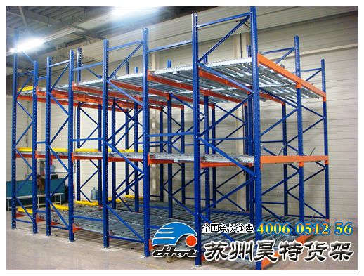 在貨架每層的通道上,都安裝有一定坡度的、帶有軌道的導軌,入庫的單元貨物在重力的作下,由入庫端流向出庫端。這樣的倉庫,在排與排之間沒有作業(yè)通道,大大提高了倉庫面積利用率。但使用時,最好同一排、同一層上的貨物,應為相同的貨物或一次同時入庫和出庫的貨物。此外,當通道較長時,在導軌上應設置制動滾道,以防止終端加速度太大。