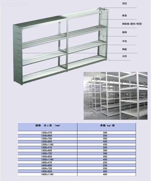 中量B型貨架,掛梁式貨架,中型貨架介于輕型和重型貨架之間。比較適合于承重比較大的人工存取方式,廣泛應用于汽車配件、電子等行業(yè)。