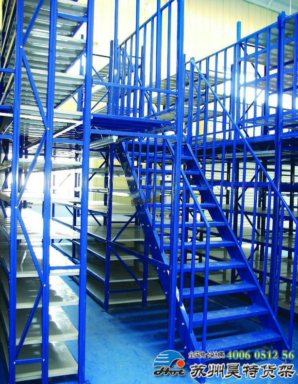 (2)重型閣樓式貨架利用重型擱板式貨架作為主體,樓面板通常選用冷軋型鋼樓板,互扣式結(jié)構(gòu),樓面板與樓板梁之間采用六維專利鎖緊機(jī)構(gòu)鎖定,與傳統(tǒng)花紋鋼樓板或鋼格柵樓板相比,它具有承載能力強(qiáng)、整體性好、承載均勻性好、精度高、表面平整、易鎖定等優(yōu)勢(shì),并且易匹配照明系統(tǒng),存取、管理均較為方便。樓面板有普通平面型、凸點(diǎn)型、鏤空型等多種類型可選,500-1000公斤之間樓面板承載通常在每平方米300-1000公斤之間,樓層間距通常為2.2m~2.7m,頂層貨架高度一般為2m左右,充分考慮人機(jī)操作的便利性。通常配設(shè)樓梯、液壓升降臺(tái)或電梯,或由叉車將貨物運(yùn)至樓上。安裝、拆卸方便靈活,可根據(jù)場(chǎng)地和需要,靈活設(shè)計(jì)成二層、三層閣樓,充分利用空間,廣泛用于汽車、電子、輕工、機(jī)械等行業(yè)。