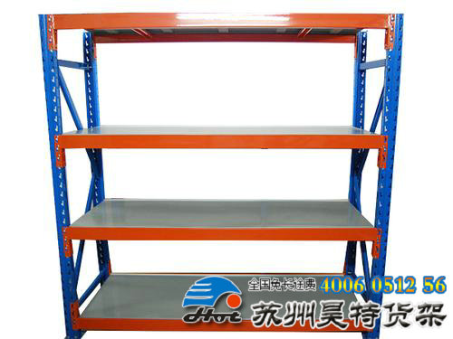 (2)中型擱板式貨架,單元貨架每層載重量一般在 200~ 800 kg 之間,總承載一般不大于 5000kg 。單元貨架跨度通常不大于 2.5m ,深度不大于 1m ,高度一般在 3m 以內(nèi)。如果單元貨架跨度在 2m 以內(nèi),層載在 500kg 以內(nèi),通常選無梁式中型擱板式貨架較為適宜;如果單元貨架跨度在 2m 以上,則一般只能選有梁式中型擱板式貨架。無梁式中型貨架與有梁式中型貨架相比,層間距可調(diào)余地更大,更穩(wěn)固、漂亮,與環(huán)境的協(xié)調(diào)性更好,更適于一些潔凈度要求較高的倉庫;有梁式中型擱板式貨架則工業(yè)化特點強(qiáng)一些,較適用于存放金屬結(jié)構(gòu)產(chǎn)品。中型擱板式貨架應(yīng)用廣泛,適用于各行各業(yè)。