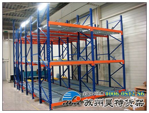 重力式貨架又叫輥道式貨架,屬于倉(cāng)儲(chǔ)貨架中的托盤(pán)類(lèi)存儲(chǔ)貨架。重力式貨架是橫梁式貨架衍生品之一,貨架結(jié)構(gòu)與橫梁式貨架相似,只是在橫梁上安上滾筒式軌道,軌道呈3-5°傾斜。托盤(pán)貨物用叉車(chē)搬運(yùn)至貨架進(jìn)貨口,利用自重,托盤(pán)從進(jìn)口自動(dòng)滑行至另一端的取貨口。重力式貨架屬于先進(jìn)先出的存儲(chǔ)方式。重力式貨架深度及層數(shù)可按需要而定。重力式貨架適用于少品種大批量同類(lèi)貨物的存儲(chǔ),空間利用率極高。