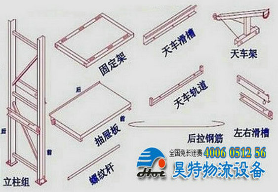如圖所示:抽屜式模具貨架由立柱組、抽屜板、天車等組成
