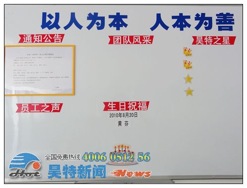 8月20日我們公司的宣傳欄,正式與大家見面,以“以人為本 人本為善”為主題 的宣傳欄分五大版塊:通知公告、員工之聲、團隊風(fēng)采、生日祝福、昊特之星,公司是想通過這五個版塊,全方面與員工拉近距離并通過物質(zhì)的獎勵,激勵大家對工作的熱情,更大的促進公司文化的進步。