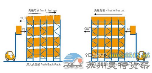 (3)壓入式貨架總深度不宜過深,一般在6個(gè)托盤深度以內(nèi),否則由于托盤小車相互嵌入的緣故而會(huì)使空間犧牲較大。單托貨物重量一般在1500kg以內(nèi),貨架高度一般在6m以下。
