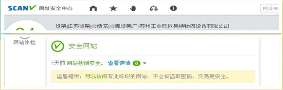 近日,公司主站《蘇州昊特貨架》不僅通過(guò)了360綠色網(wǎng)站認(rèn)證,還通過(guò)了SCANV認(rèn)證,不僅能夠得到更多客戶的信任和支持,還能展現(xiàn)出公司的企業(yè)實(shí)力,務(wù)客戶無(wú)論從產(chǎn)品質(zhì)量上還是從上網(wǎng)安全上都做到了細(xì)致入微的保障!