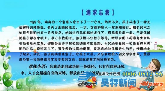 1858年,瑞典的一個富豪人家生下了一個女兒。然而不久,孩子染患了一種無法解釋的癱瘓癥,喪失了走路的能力。一次,女孩和家人一起乘船旅行。船長的太太給孩子講船長有一只天堂鳥,她被這只鳥的描述迷住了,極想親自看一看。于是保姆把孩子留在甲板上,自己去找船長。孩子耐不住性子等待,她要求船上的服務(wù)生立即帶她去看天堂鳥。那服務(wù)生并不知道她的腿不能走路,而只顧帶著她一道去看那只美麗的小鳥。奇跡發(fā)生了,孩子因為過度地渴望,竟忘我地拉住服務(wù)生的手,慢慢地走了起來。從此,孩子的病便痊愈了。女孩子長大后,又忘我地投入到文學(xué)創(chuàng)作中,最后成為第一位榮獲諾貝爾文學(xué)獎的女性,也就是茜爾瑪;拉格蘿芙。