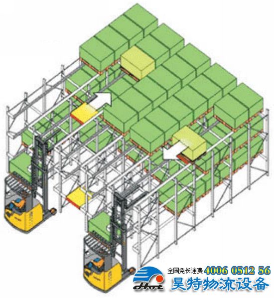 1、貫通式采用格構(gòu)式立柱邊續(xù)方式連接起來的多門式、托盤單元化貨品沿深度方向一個緊接一個存儲在導軌上的貨架結(jié)構(gòu)形式;