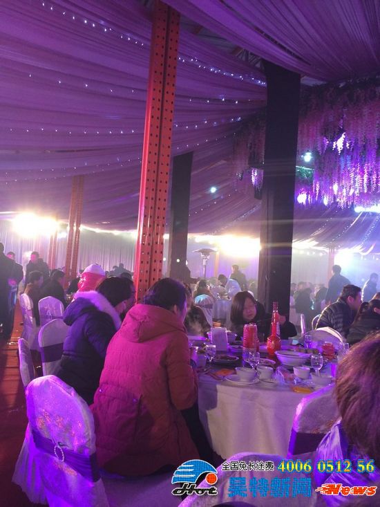 走進(jìn)宴會(huì)廳,當(dāng)我們還沉浸在貨架在廚房新用途而沾沾自喜的時(shí)候,眼前美麗的會(huì)場(chǎng)布置瞬間吸引了我們的目光,落座后,細(xì)看會(huì)場(chǎng),竟然不是鋼筋水泥框架鋪蓋的磚瓦房,也不是蘇州通常喜宴搭建的木櫞堂,而是用重型貨架的立柱、懸臂貨架立柱為支撐,以圓管、方管為梁,房頂則鋪滿了彩鋼板。