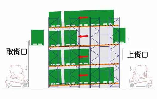 具體是:每一列貨架都有輥筒、阻尼等組成的滑道,每個滑道可分為若干個單元格,而每個單元格的貨物因貨架一端到另外一端的3度的坡度,可自行落下,入庫時,叉車在進貨口及坡度較高的一端將貨物放置在滾筒上,則貨物可因為自身的重量滑向出庫端或已有貨物但愿的后面,當要出庫的時候,叉車取走出貨端口即坡度較低一端的貨物,而后面貨物但愿下滑到出庫端的第一個貨位。