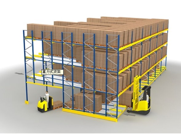 重力式貨架是在普通橫梁式貨架的結(jié)構(gòu)上發(fā)展起來的貨架類型,依靠橫梁式貨架的結(jié)構(gòu),在貨架上配置輥筒裝置,坡度在3度左右,利用貨物自身的重量先進先出,適用于大批量同等貨物,空間利用率極高,但托盤活魚一般在1000kg以內(nèi),可配置阻尼輥筒,以減緩托盤下滑速度!
