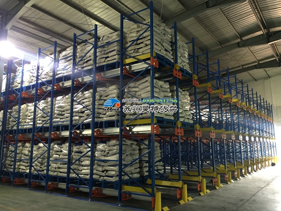 駛?cè)胧截浖苁前褦?shù)排立柱片連接起來,沒有橫梁結(jié)構(gòu),用頂梁支撐,采用導(dǎo)軌和托盤軌道連接而成,托盤直接放置在導(dǎo)軌上,叉車可以駛?cè)胪ǖ纼?nèi)存儲貨物,先進后出,適用于少品種大批量存儲,空間利用率約為60%-70%,完全可以滿足食品行業(yè)的冷庫需求。