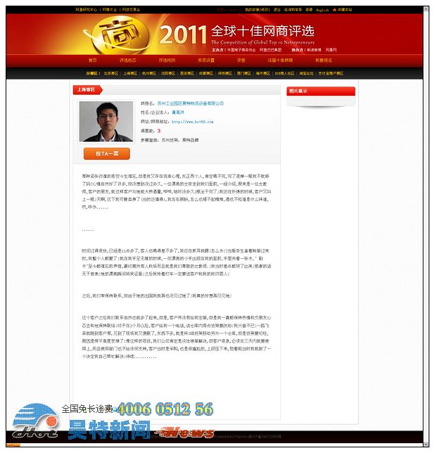 3月28日,新經(jīng)濟(jì)領(lǐng)域最具影響力的人物評選活動(dòng)——“2011全球十佳網(wǎng)商評選”正式拉開了帷幕,為進(jìn)步更好更廣的服務(wù)于客戶,蘇州昊特貨架公司,也積極參加了此次評選活動(dòng),希望可以得到更多的朋友支持,可以與大家分享我們的網(wǎng)商故事,歡迎投票:2011全球十佳網(wǎng)商評選 - 分賽區(qū) - 詳細(xì) http://www.aliresearch.com/aliws/story.php?id=1027783